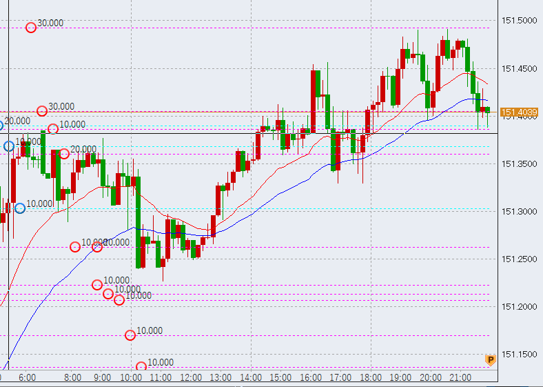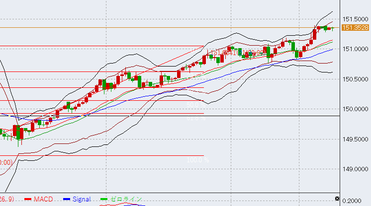 日本時間は高値からのスタート。このまま高値151.7を目指すのか、それとも一旦調整下落に入るのかに注目しています。