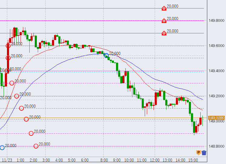 15時過ぎ、148.9円付近まで下落。約0.8円ほど下げました。欧州時間後の値動きに注目です。