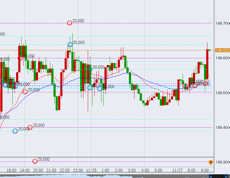 9時過ぎ高値アタック。まずは149.8円あたりを狙いそうです。