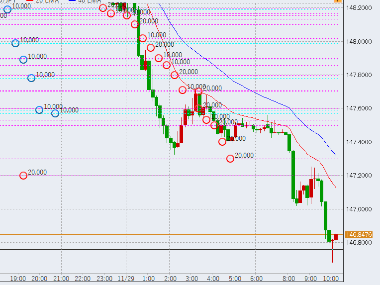 ドル円は早朝から下落。ただまだ落ちそうですので、決済はしません。一旦の下落目処は144.6円-146円近辺と見ています。