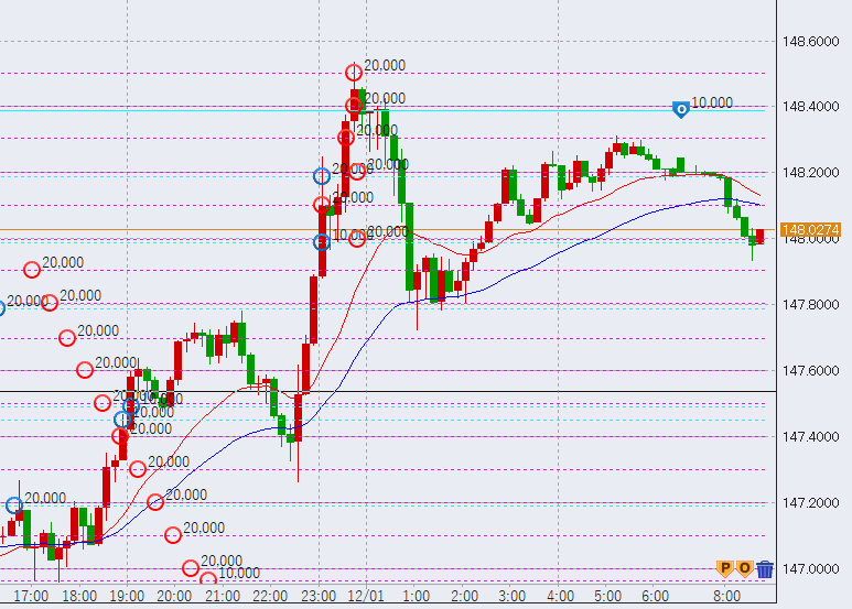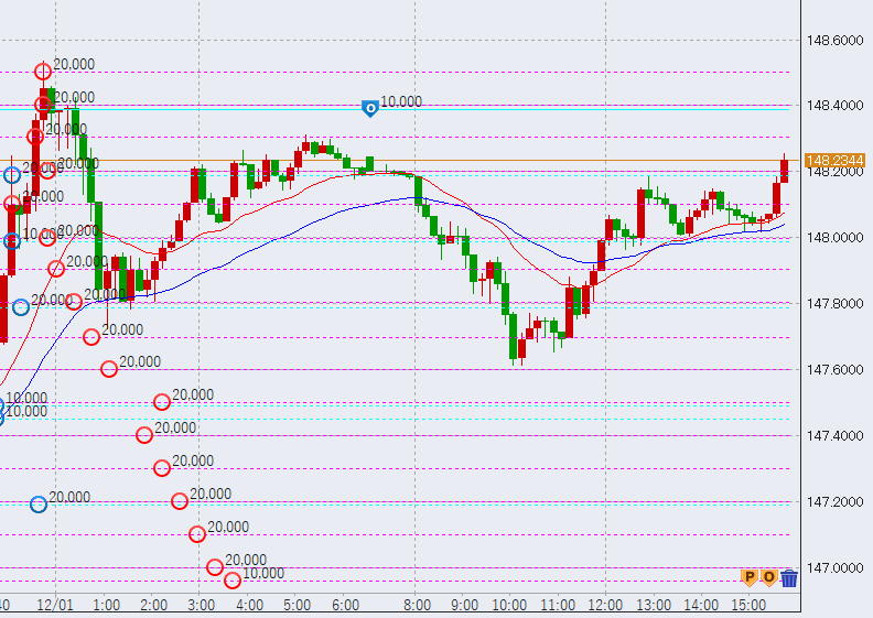 15時過ぎ反発し、早朝の水準まで戻ってきました。まずは149円付近まで戻しそうですが、その後の展開は難しそうです。