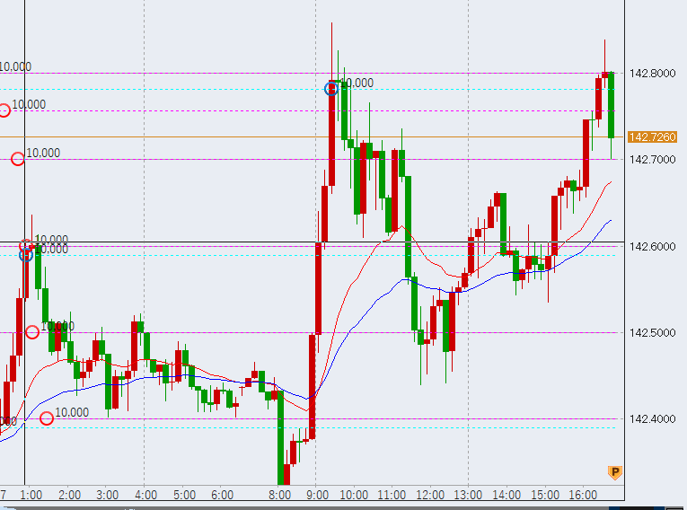 16時過ぎ高値再アタック、142.8円付近。まだ昇っていきそうです。