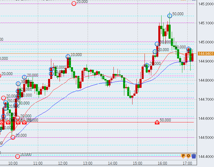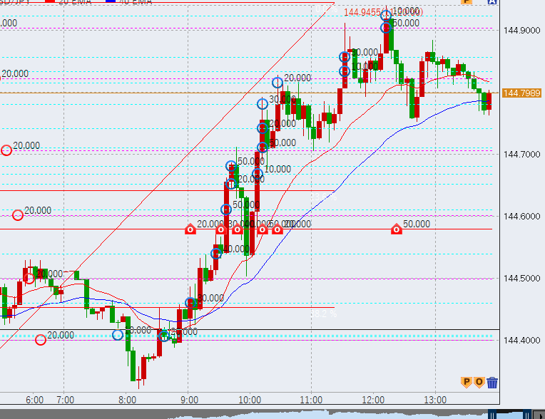 13時過ぎ。144.9円まで昇った後小さく反落。売り47万ほどですが、下の部分はカットします。