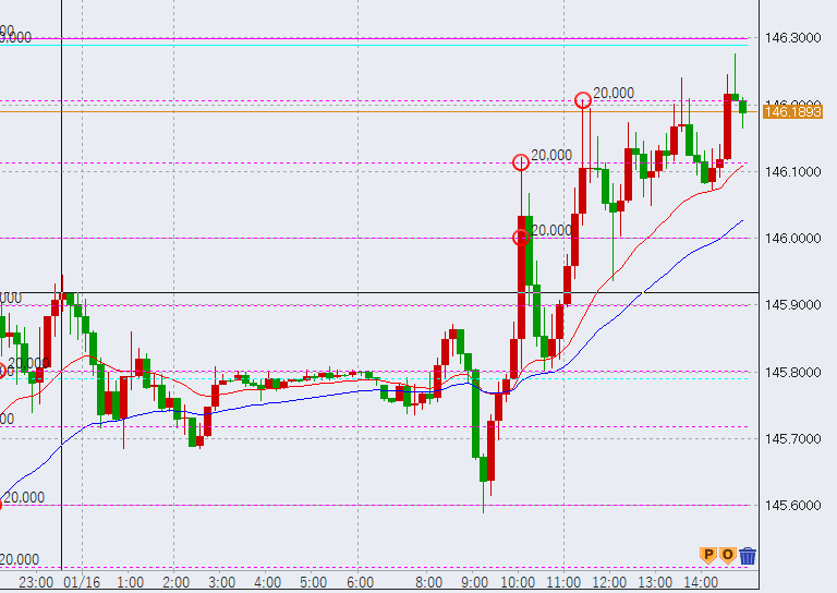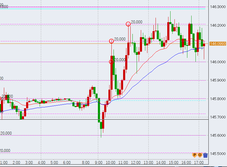 午後14時過ぎ上昇。高値146.2をマークしました。これで再度日足高値に接したため、さらに上昇していく可能性があります。
