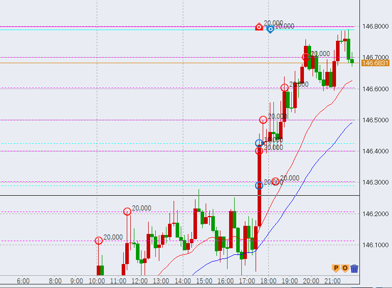 21時過ぎ146.7円を超えてきました。次の高値は147.5円付近で、この辺りまでは伸びそうです。