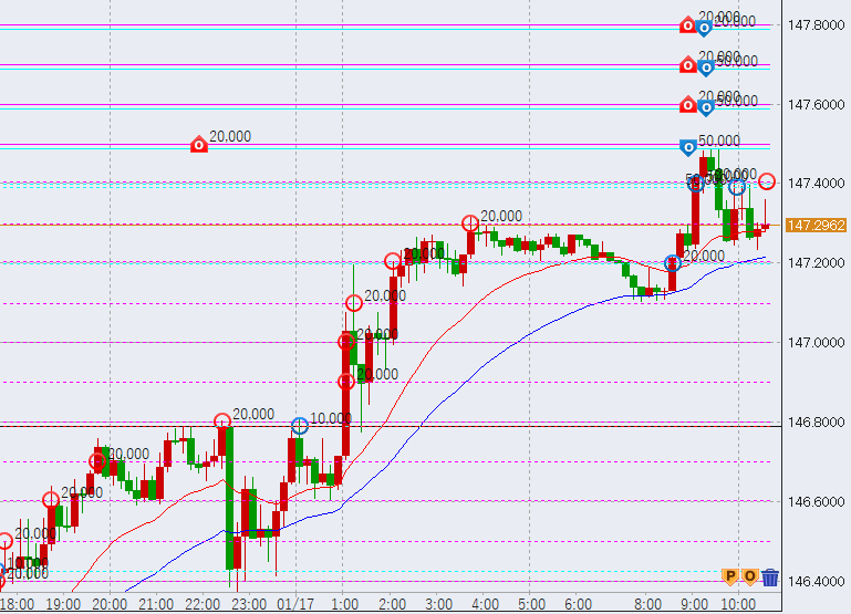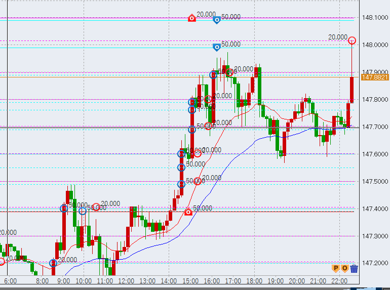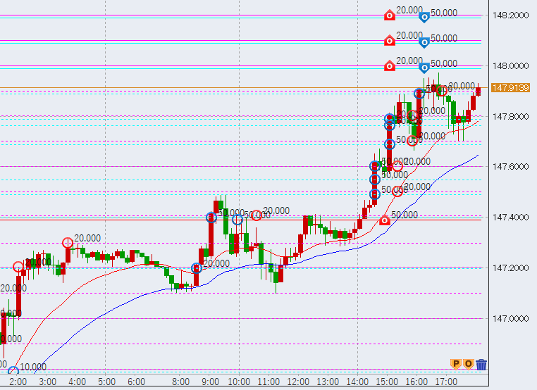 日中で148円近くまで伸びました。18時過ぎ、まだ高値付近。