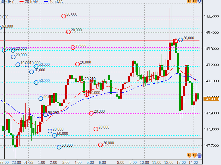 14時過ぎ早朝より安値。日銀が現状維持を発表しましたが、上値は重い。この後、欧州時間でどういう値動きをするかに注目です。