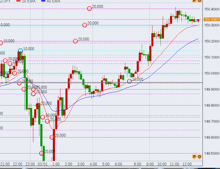 13時前、早朝より0.4円ほど上昇し150.3円付近。